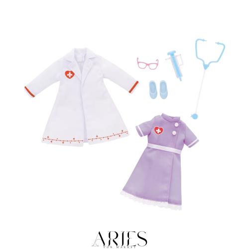 【セット内容】ワンピース(1),白衣(1),メガネ(1),クツ(1),聴診器(1),注射器(1),※人形は別売です。