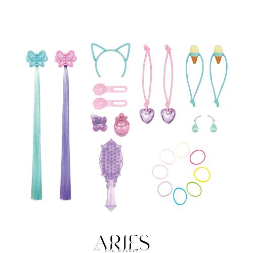 【セット内容】バタフライエクステミントグリーン(1),バタフライエクステパープル(1),ネコミミカチューシャ(1),イヤリング(1),ジェラートポニー(2),ハートジュエルポニー(2),チェリークリップ(1),ストロベリークリップ(1),ホイップクリームクリップ(2),すてきなブラシ(1),カラフルヘアゴム(8),