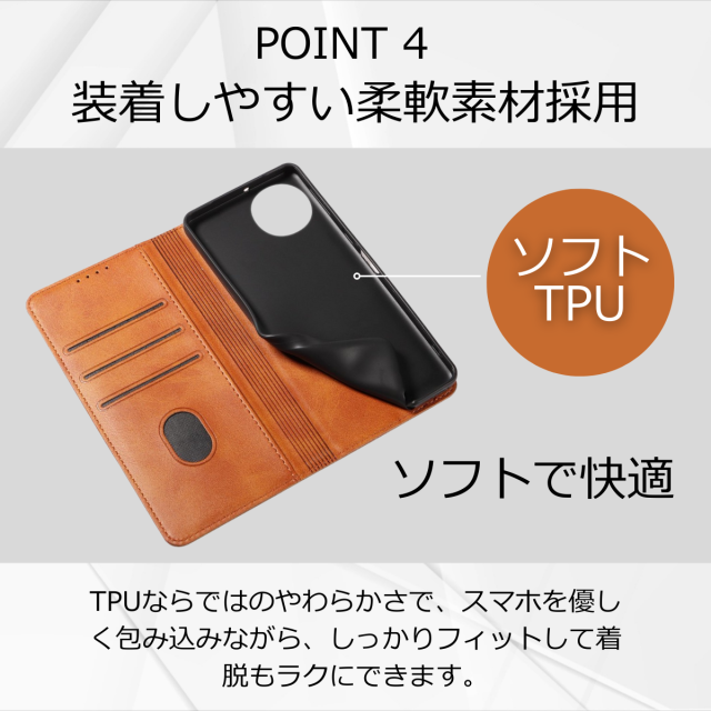 外側は高級感のあるPUレザー、内側は衝撃をやわらげるTPU素材を採用し、大切な端末をしっかり保護します。
