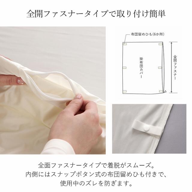 | ■まるでシルクのようななめらかな肌触りの掛け布団カバーです。 ■ひんやり感のある糸を組み合わせて織り上げた接触冷感生地を使用しています。 ■全開ファスナーで取り付け簡単。内側にはスナップボタン式の布団留めひも付き。 |