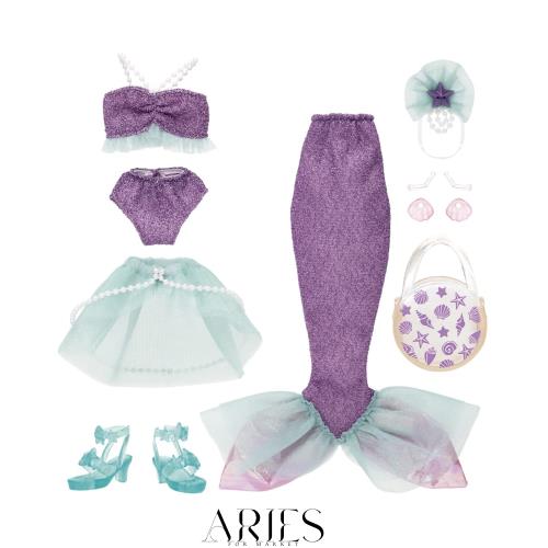 セパレートタイプの水着と人魚のしっぽがセットになった#Licca(ハッシュタグリカ)用のドレスセットです。 マーメイドのヒレをつければ人魚スタイルも楽しめちゃう、ラメ生地が大人っぽい水着セット。 海をイメージした貝がらのイヤリング、ヘアアクセサリー、バッグとサンダルが付属します。 ※人形は別売です。 ※#Liccaと通常のリカちゃんのドレスやクツなどは兼用できますが、身長が異なるので着せ付けた時のイメージは異なります。 (一部、通常のリカちゃんのロングブーツなどのクツ、ズボンなどは#Liccaでは着せられない事があります。) 【セット内容】水着トップス(1),水着ボトムス(1),オーバースカート(1),マーメイドのヒレ(1),ヘアアクセサリー(1),イヤリング(1),バッグ(1),サンダル(1),※人形は別売です。,