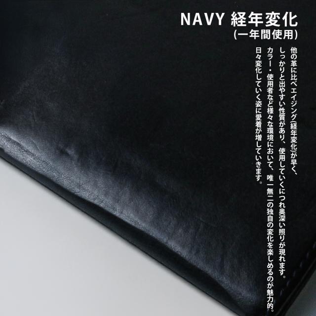 くすみがかったネイビーは経年とともにツヤが増し黒に近い濃紺に変化していきます。