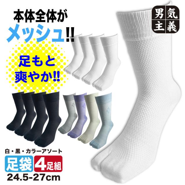 足袋ソックス メンズ メッシュ 夏用 4足セット クルー丈 黒 涼感 ムレにくい クールメッシュソックス 24.5cm-27cm