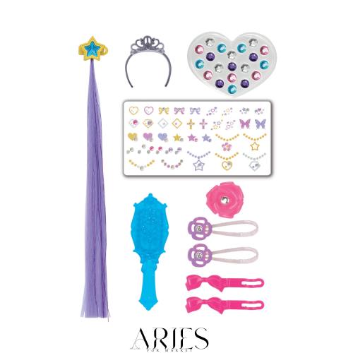 [セット内容]ヘアエクステ(1),ティアラ(1),ヘアゴム(2),ブラシ(1),ラインストーン(1),シール(1),ヘアクリップ(2),
