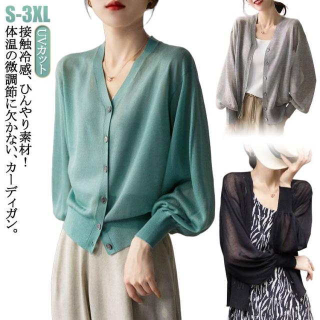サマーカーディガン レディース uv 接触冷感 シアーニット uvカット カーディガン 薄手 春 夏 Vネック サマーニット 長袖 UV対策 ミドル丈 羽織 紫外線対策 オフィス 冷房対策 日焼け防止 送料無料 アウター 送料無料