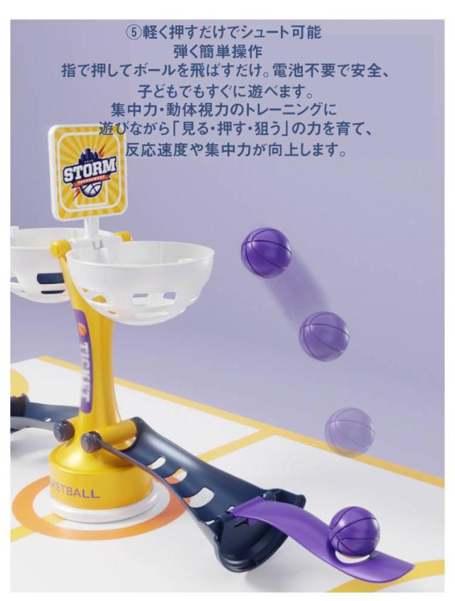 | 楽しみながら反射神経や集中力、手先の器用さを育てる知育ゲームです。 シンプル操作で白熱の対戦ができ、親子のコミュニケーションや友達との遊びにぴったり! 2人同時に遊べる対戦型デザイン 左右に分かれてボールをシュート!どっちが多く入れられるか競争しながら楽しめます。 弾く簡単操作 指で押してボールを飛ばすだけ。電池不要で安全、子どもでもすぐに遊べます。 親子・兄弟・友達と盛り上がる 家族で遊んだり、お友達と勝負したり、自然に会話や協力が生まれる楽しいおもちゃです。 集中力・動体視力のトレーニングに 遊びながら「見る・押す・狙う」の力を育て、反応速度や集中力が向上します。 コンパクトで収納も簡単 卓上サイズなので場所を取らず、家でも外出先でも手軽に遊べます。 説明: 1.吸盤を底部に取り付ける 2.両側の折りたたみ式レールを開く 3.両側のシュート台を開く 4.両側のバスケットゴールを開く 5.軽く押すだけでシュート可能 | |