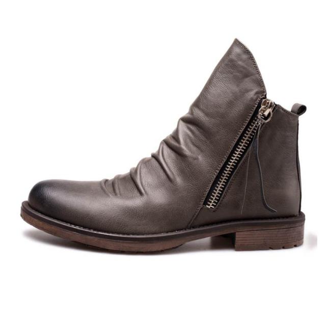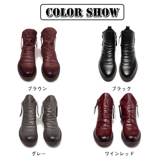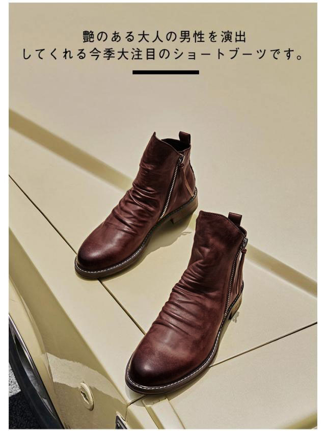 | 艶のある大人の男性を演出してくれる今季大注目のショートブーツです。 焦がし加工によるヴィンテージ仕上げで本革に劣らない風合いを醸し出しています。 アッパーのドレープが程良いこなれ感が演出し、細かな細工が足元を引き立たせます。 両サイドのジッパーで着脱簡単な部分も嬉しいポイント。 シーズン問わず使えるブーツなので、1足は持っておきたい必須アイテムです。 スマートなシルエットに、ドレープのきいたデザインはこなれ感を演出し、大人の色気を漂わす。 両サイドに施されたジッパーは、控え目な出で立ちの中に、アクセサリーを付けたような存在感。 | |