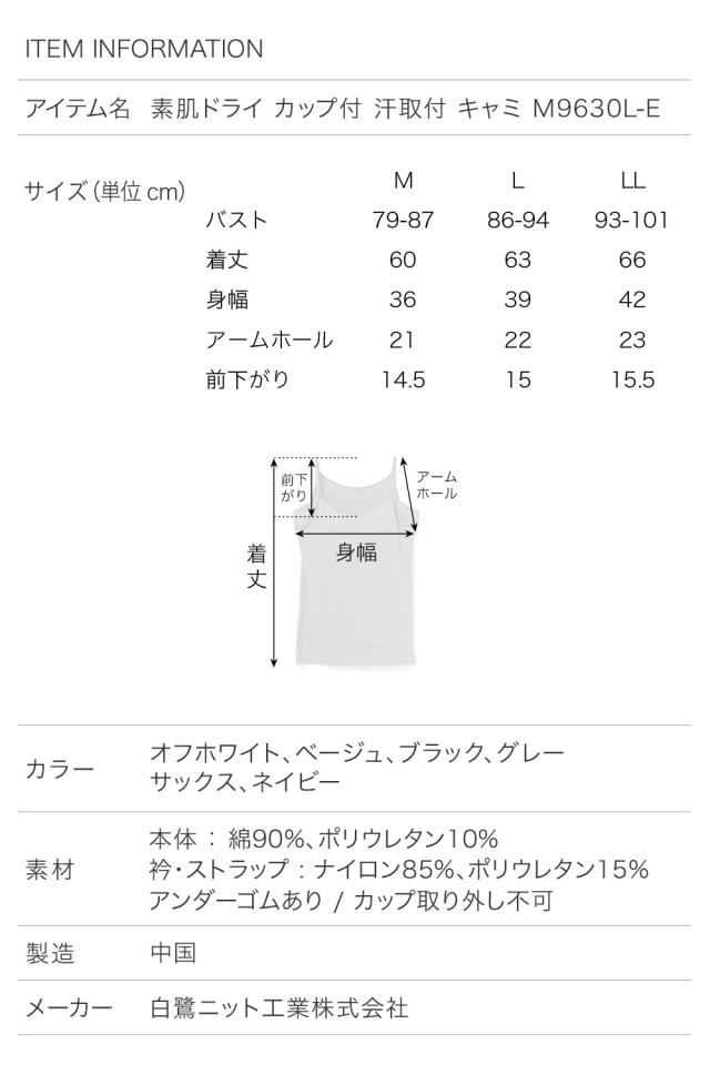 素肌ドライ Premium 汗取り付きブラトップ キャミソール インナー 汗取り 脇汗 汗染み 防止 肌着 あせ キャミ レディース 春夏 汗 対策 シャツ ブラカップ カップ パット 綿混 吸汗速乾 消臭 接触冷感 25SS M9630L-E