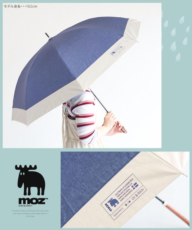 moz 傘 レディース 58cm 晴雨兼用 1級遮光 UVカット 紫外線対策 長傘 レイングッズ 雨具 撥水 手開き 梅雨 アンブレラ アウトドア ブランド ロゴ バイカラー シャンブレー調 かわいい おしゃれ 小さい コンパクト 雨傘 日傘 黒 ブラック ネイビー ベージュ モズ 554925