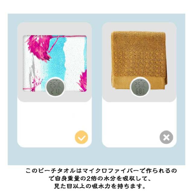 | 防砂ビーチタオル。このビーチタオルは超微細繊維で作られるので砂がつきにくいし、細い砂がタオルに落ちても直接吹き飛ばせばオーケです。防砂性能が良い、ビーチマットとしても楽に清潔できます。 吸水性&速乾性!このビーチタオルはマイクロファイバーで作られるので自身重量の2倍の水分を吸収して、見た目以上の吸水力を持ちます。薄型設計で速乾性能も抜群です。 軽量&コンパクト!このビーチタオルは超軽量です。折りたたみ可能なコンパクト設計で、簡単にバッグに入れます。ビーチや旅行 や温泉等のアウトドア活動に最適です。 | |