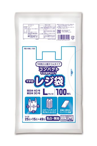 オルディ(ORDIY) レジ袋 マチ付き 乳白 L 100枚入 西日本40号 東日本30号 2Lペットボトルが約3本入る大きさ 収納に便利なコンパクトパッケージ 取って付きごみ袋 RB-HWL-100