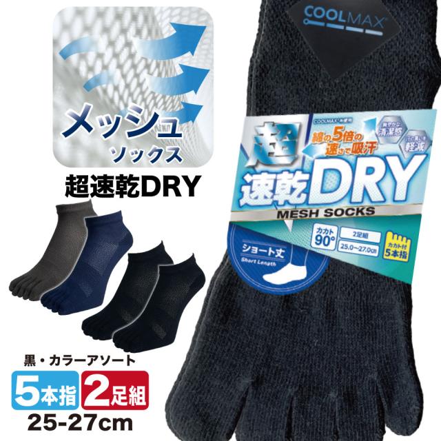 五本指靴下 メンズ くるぶし 2足組 超速乾ドライ メッシュ五本指ソックス クールマックス ショート丈 25cm-27cm かかと90度 スポーツ