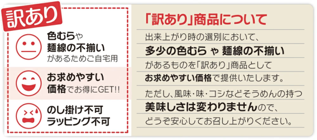 出来上がり時の選別において、多少の色むらや 麺線の不ぞろいがあるものを 訳あり として提供いたします。
