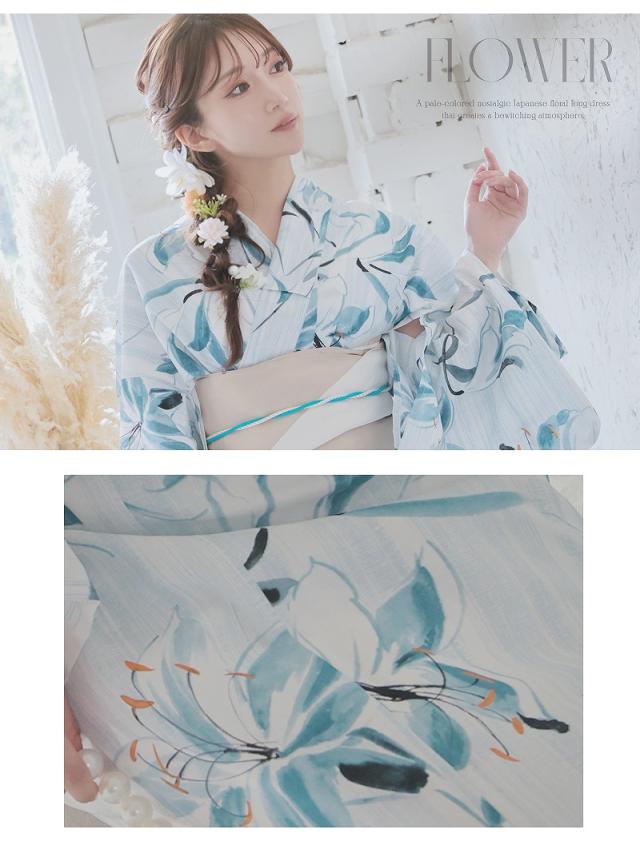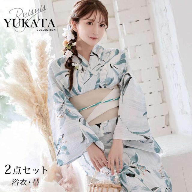 予約販売 キャバ浴衣 Ryuyu 青 白 ブルー 大人かわいい 百合 浴衣 セット レディース 浴衣レディース レディース浴衣