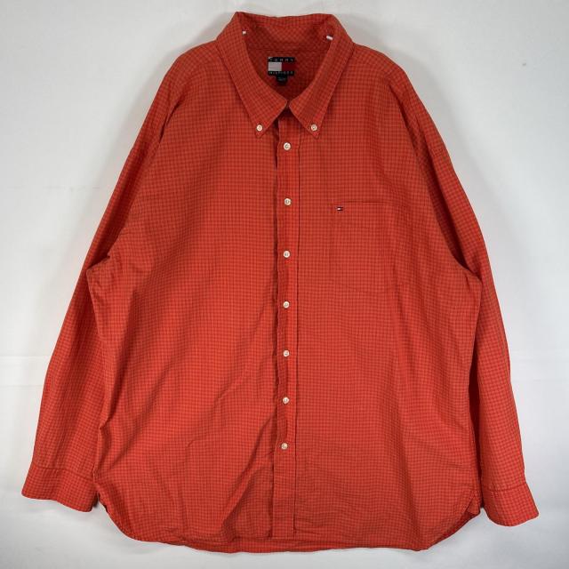 古着 90s/90年代 トミーヒルフィガー TOMMY HILFIGER 長袖シャツ ロゴ 刺繍 大きいサイズ ボタンダウン XXL オレンジ チェック メンズ