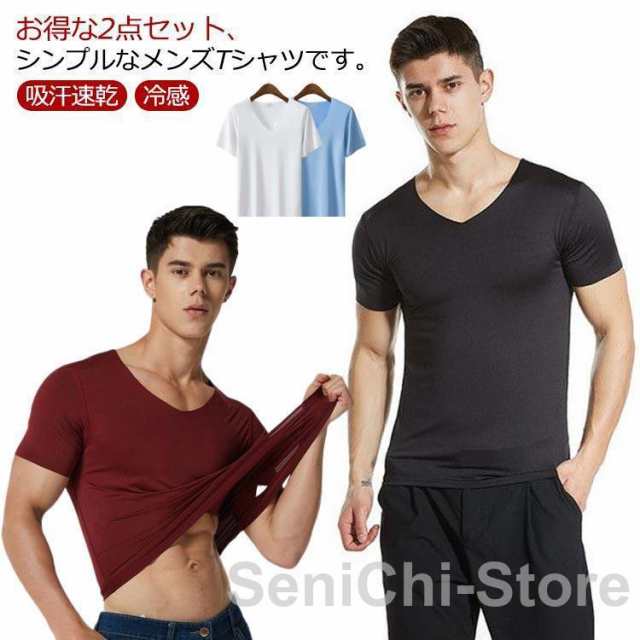 接触冷感 インナーTシャツ メンズ Vネック Tシャツ ストレッチ 2点セット シームレス 半袖 半袖Tシャツ アイスシルク スリム ルームウェア