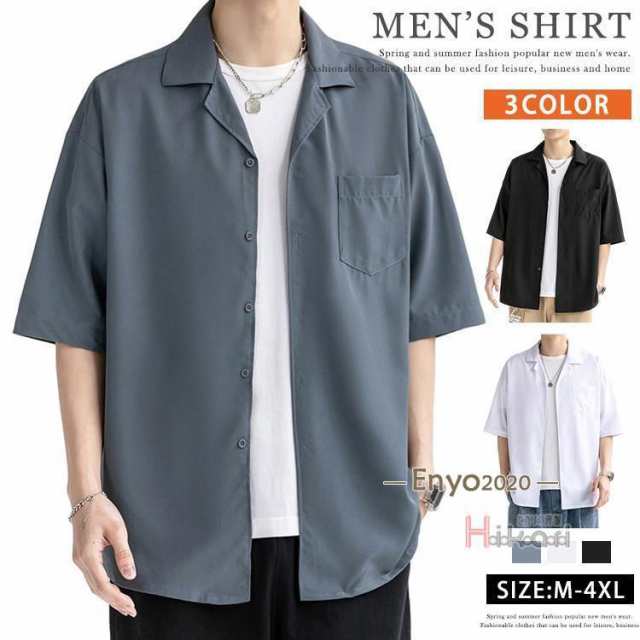 開襟シャツ メンズ 半袖シャツ オープンカラーシャツ カジュアルシャツ 白シャツ 黒 グレー 無地 シンプル 夏 夏物