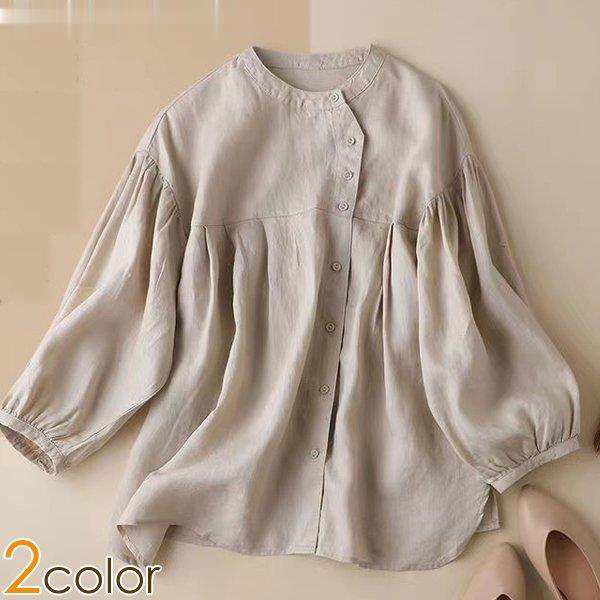 シャツブラウス レディースシャツ 麻綿混紡 バルーンスリーブ ゆったり シャツ ブラウス レディース トップス