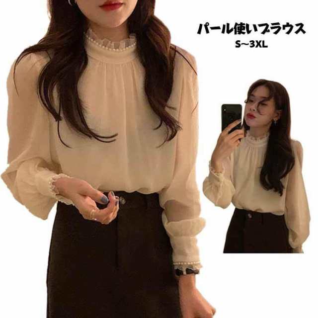 トップス ブラウス 長袖 タートルネック レース パール バルーン袖 無地 通勤 可愛い セレモニー 卒業式 入学式 レディース 春 トップス 送料無