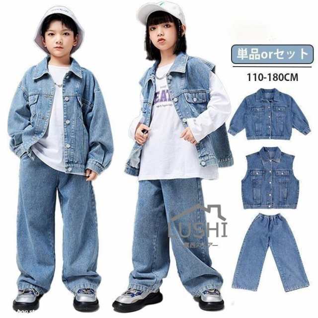 デニム 上下 ダンス 衣装 キッズ セットアップ デニム ジャケット デニムベスト ジーンズ 子供服 ストリート デニムパンツ ガールズ 男の子 女の子