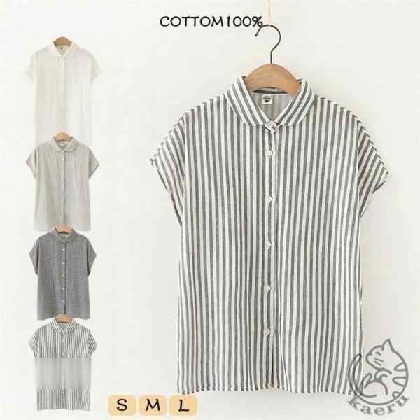 シャツ ブラウス フレンチスリーブ トップス レディース 女性用 ガーゼ ノースリーブ 綿100% コットン100% コットン リネンコットン ナチュラル ラウンドカラー 丸襟 襟 前開き 抗菌 無地 チェック ストライプ 白 ホワイト グレー コーデ 30代 40代 50代 母の日 プレゼント 春 夏 ファッション ytolive ウイトライプ