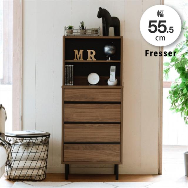 | 落ち着いた木目調のブラウンとブラックスチールの組み合わせがモダンな印象を与える、北欧テイストシリーズ“Fresser”。 4段のチェストに有孔ボード付きのラックが付いたディスプレイチェストラック。 シンプルなデザインながら、飾るもので個性を演出できます。 |