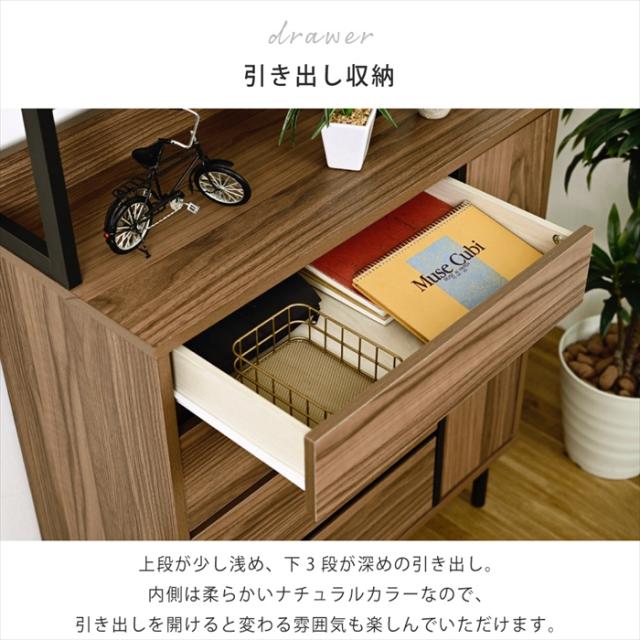 | [内寸] (オープンラック左)幅51×奥行32.5×高さ43cm (オープンラック右)幅20×奥行32.5×高さ45cm (引き出し1段目)幅46×奥行28.5×高さ5.5(有効:7)cm (引き出し2〜3段目)幅46×奥行28.5×高さ7.5(有効:9)cm (引き出し4段目)幅46×奥行28.5×高さ7.5(有効:11)cm (扉内)幅17(有効:20.5)×奥行31.5×高さ66.5cm (脚間)幅66.5×奥行26.5×高さ14.5cm |