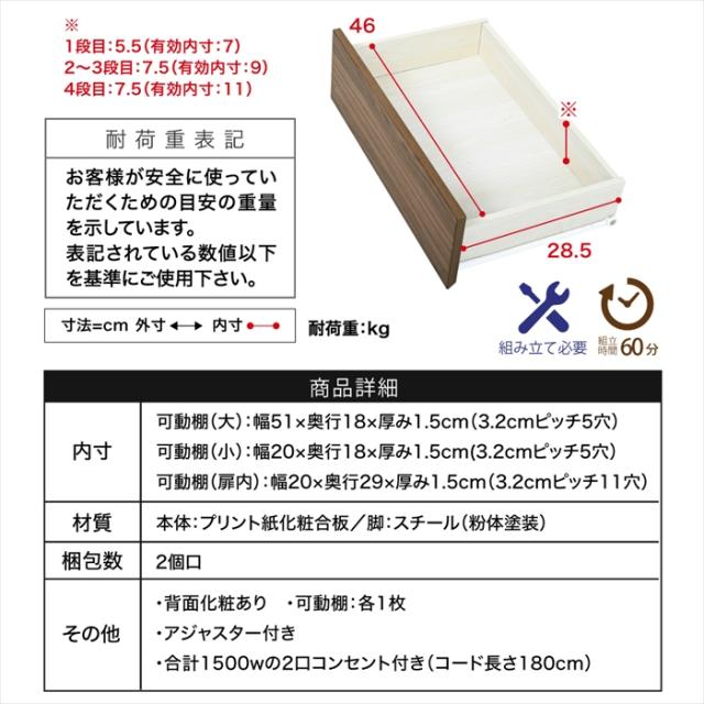| [チェスト上]約10kg以下 [引き出し1段目]約3kg以下 [引き出し2〜4段目]約5kg以下 [可動棚]各約5kg以下 [固定棚]各約5kg以下 |