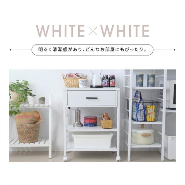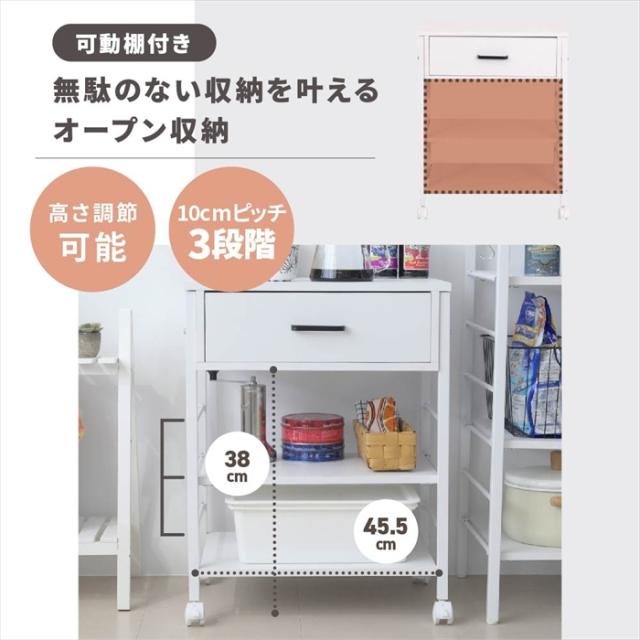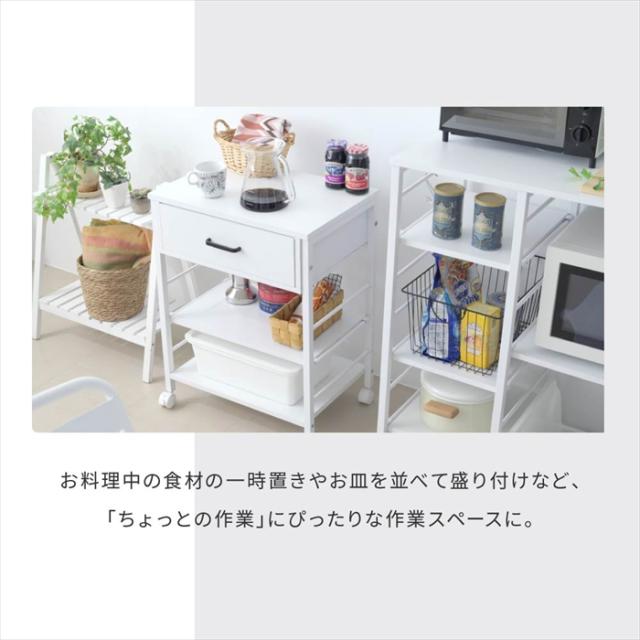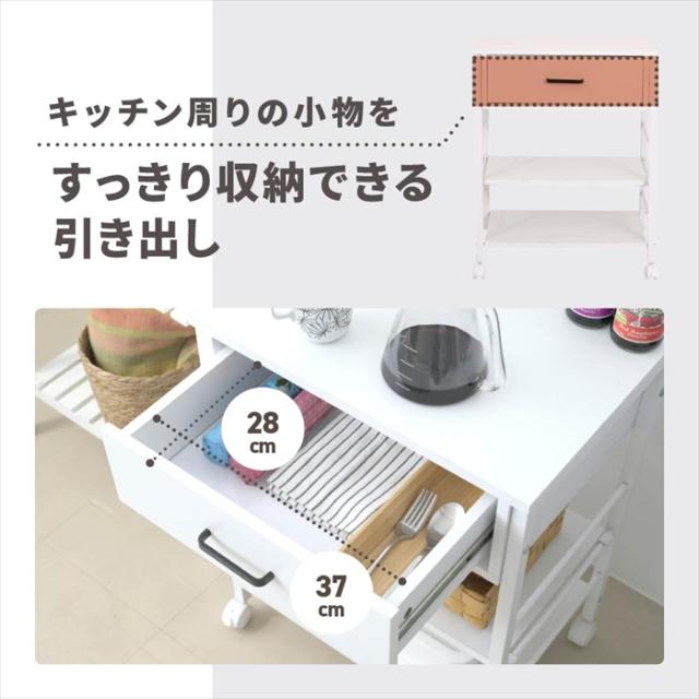 | 幅50cmのキャスターが付いて移動がラクラクキッチンワゴン。 引き出しが1杯付いているので、カトラリーなどのキッチンで使う小物を収納することもできます。 キッチン収納としてだけでなく、デスクサイドに置いてデスクワゴンとしてや、日々使うメイク道具などを収納してコスメワゴンとしても。 |