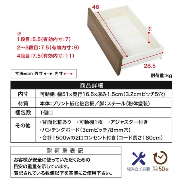 | [内寸] (オープンラック)幅51×奥行33×高さ43cm (可動棚)幅51×奥行16.5×厚み1.5cm(3.2cmピッチ5穴) (引き出し1段目)幅46×奥行28.5×高さ5.5(有効:7)cm (引き出し2〜3段目)幅46×奥行28.5×高さ7.5(有効:9)cm (引き出し4段目)幅46×奥行28.5×高さ7.5(有効:11)cm (脚間)幅44.5×奥行26.5×高さ14.5cm |
