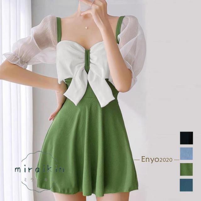 水着 体型カバー リボン ワンピース水着 レディース 水着セット ビーチファッション 韓国風水着 シースルー袖 スイムウエア プール遊び 海水浴場