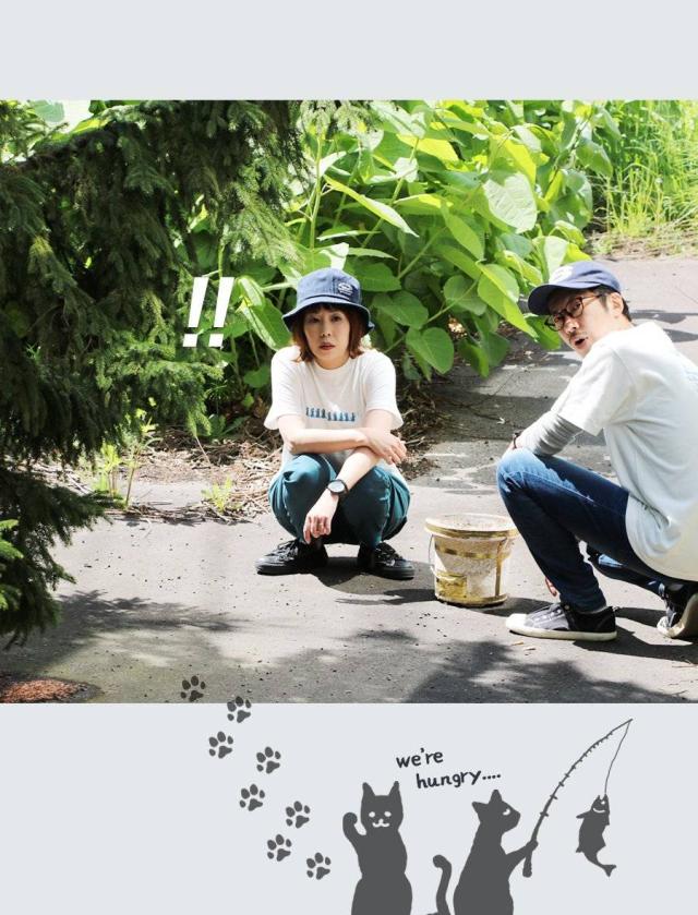 ・フロントにはねこたちが並ぶ中、一匹が釣り竿を手に「獲物」を捕まえたよう。