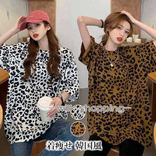 Tシャツ レディース トップス 半袖 夏 ロング丈 ヒョウ柄 体型カバー 大きいサイズ ティーシャツ クルーネック カジュアル シンプル ベーシック 大人 着痩せ 韓国風