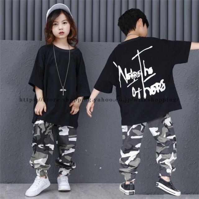 キッズ ダンス衣装 ヒップホップ HIPHOP 子供 ダンストップス 迷彩パンツ Tシャツ ダンスパンツ 長ズボン ジャズダンス 練習着