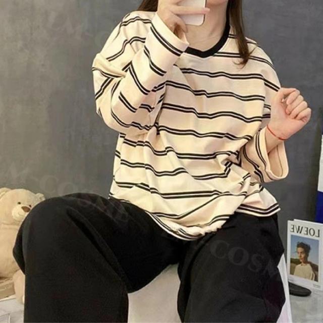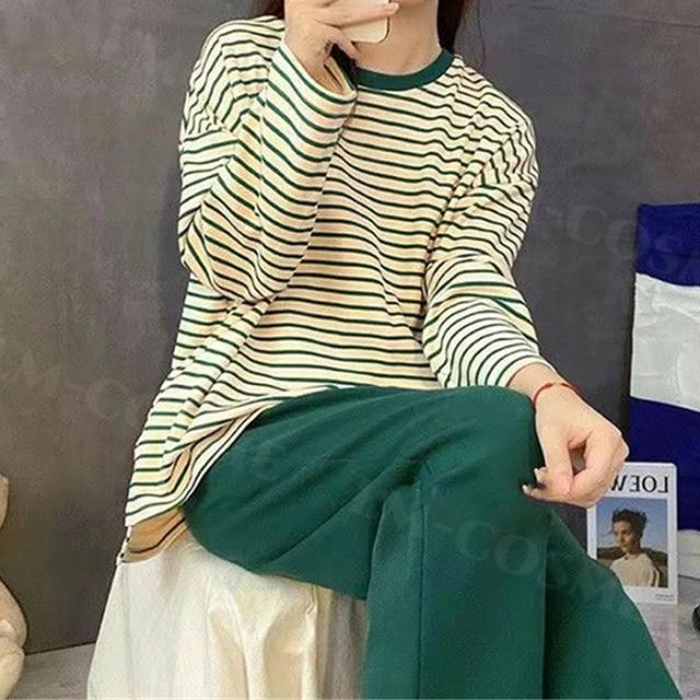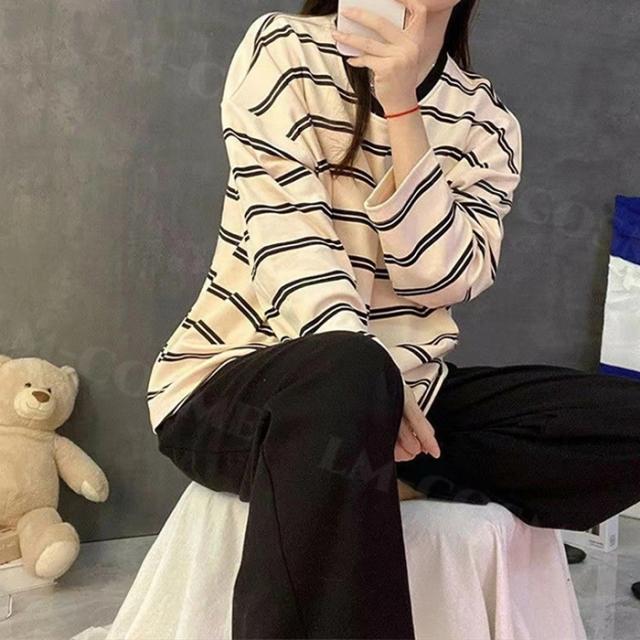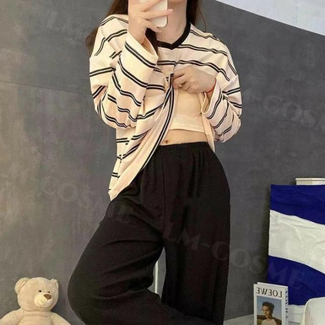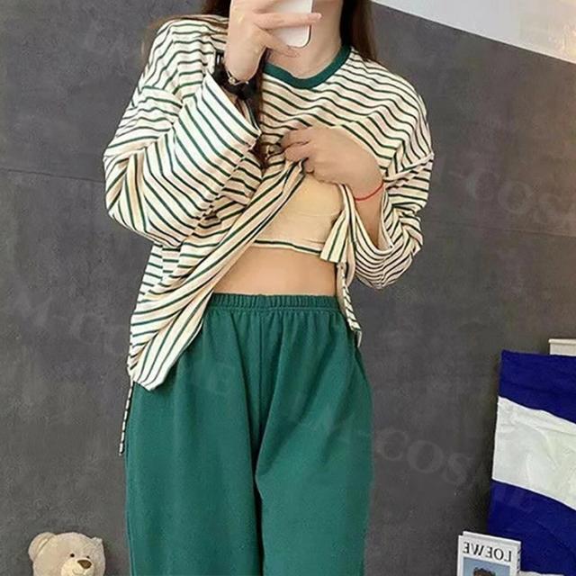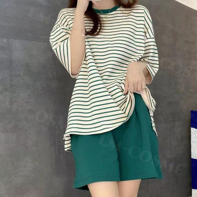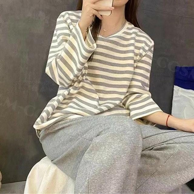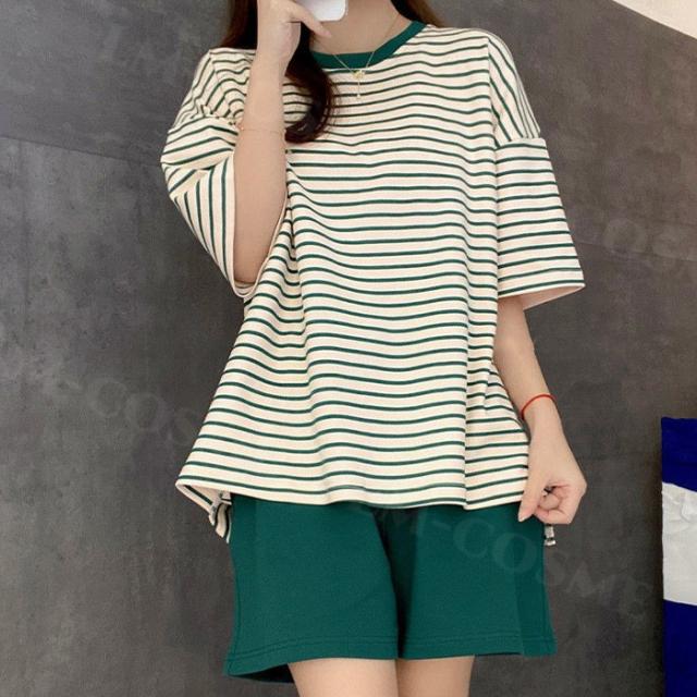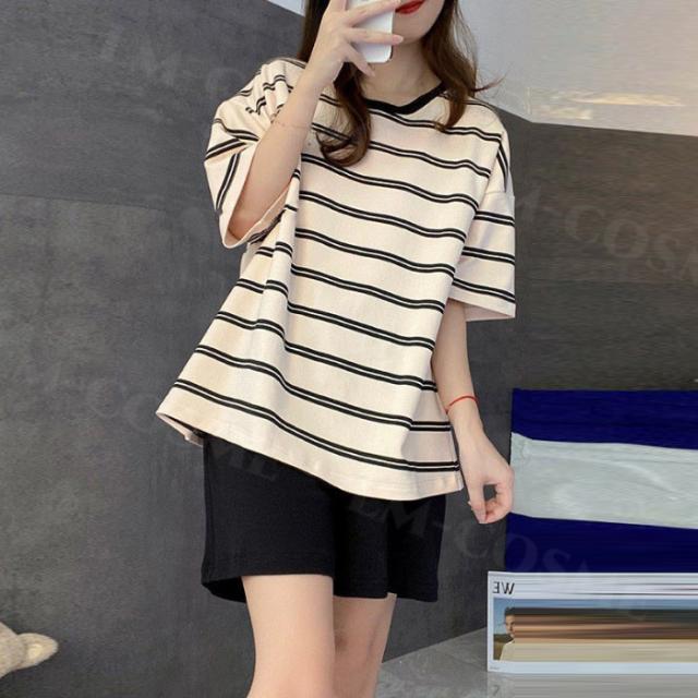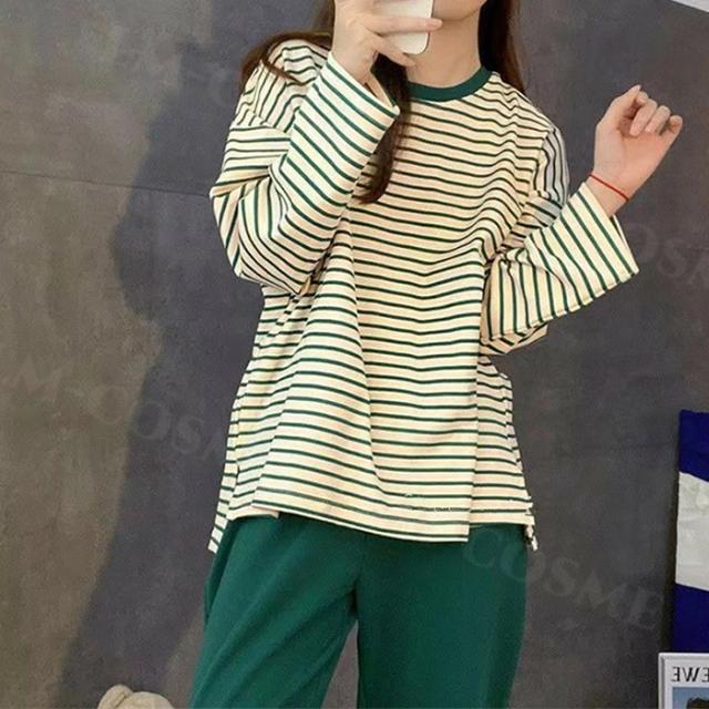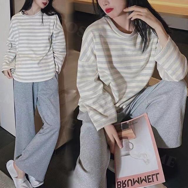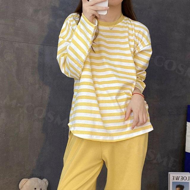 シンプルなボーダー柄のトップスと無地のボトムスを組み合わせたルームウェアです。