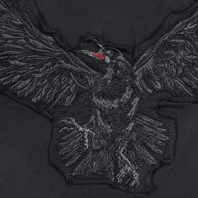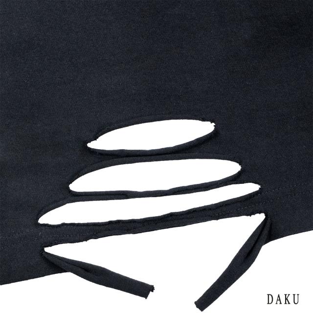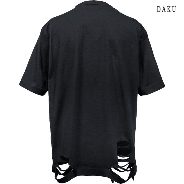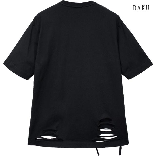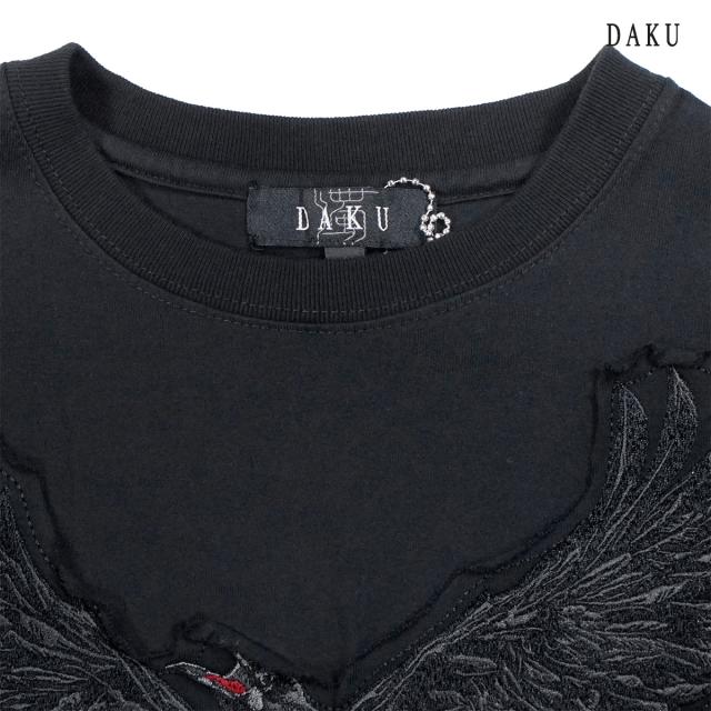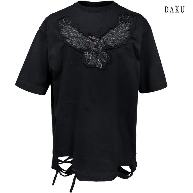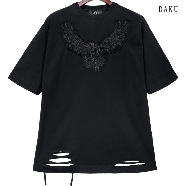 DAKU 濁 ダメージTシャツ 半袖 クルーネック カラス 刺繍 ダメージ ユニセックス メンズ レディース(ブラック黒) 252058