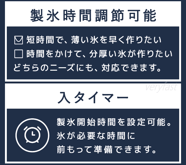 自宅で手軽に透き通った綺麗な氷が楽しめる!水を入れてボタンを押すだけの簡単2ステップで氷ができます。製氷時間約10〜24分。製氷時間調節可能なので短時間で薄い氷を早く作りたい、時間をかけて分厚い氷が作りたい等どちらのニーズにも対応できます。製氷開始時間を設定可能。氷が必要な時間に前もって準備ができる入りタイマー付き。暑い夏、冷蔵庫の氷だけじゃ足りない・・家族が多くて氷がすぐになくなる・・パーティやイベントで氷が多量に必要・・そんなときには高速製氷機があると便利です。■本体寸法約W280×D380×H360mm■本体重量約1.34kg■電源AC100V 50/60Hz■消費電力190W■運転音<55dB■コード長1.0m■貯水容量:約2.5L(給水タンク1.6L+製氷タンク0.9L)■氷保管量約1.57kg(約168個)■製氷時間約10〜24分(目安)■製氷量約20kg/日■付属品:アイススコップ、氷ケース、取扱説明書(保証書)※製氷時間は目安です。季節や使用環境・状況など温度の状態により異なります。本製品は一般家庭用です。業務用等にご使用にならないで下さい。