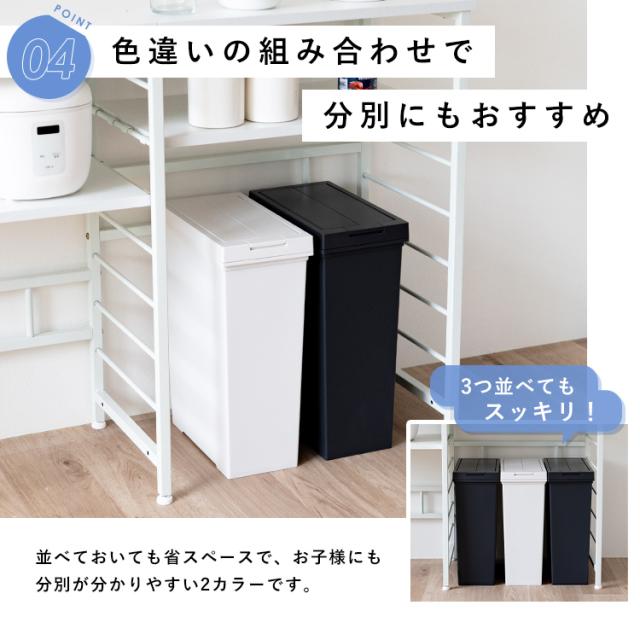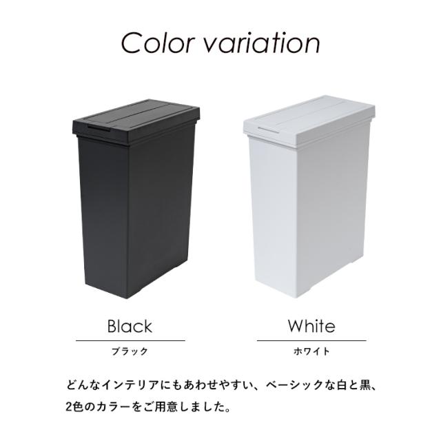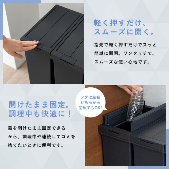 ワンタッチでフタが開く。フタが両方に開く構造でキッチンの収納ユニットにぴったり収まります。20リットルのスリム設計で2〜3台組み合わせれば分別にも最適。ゴミ袋をセットできる袋止め付き。 場所を取らないスリム設計でキッチンはもちろん。寝室やデスク横にもぴったりです!