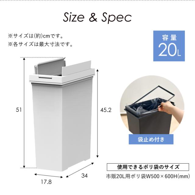 容量 : 20リットル サイズ : 幅17.8×奥行34.0×高さ45.2cm(フタ開放時の高さ 約51cm) 材質 : 本体・ポリ袋止め=ポリプロピレン、フタ・フタ枠・ロックレバー=ABS樹脂、ロック軸・固定リング・リンクバー=ポリアセタール、フタ用バネ・レバー用バネ=ステンレス鋼