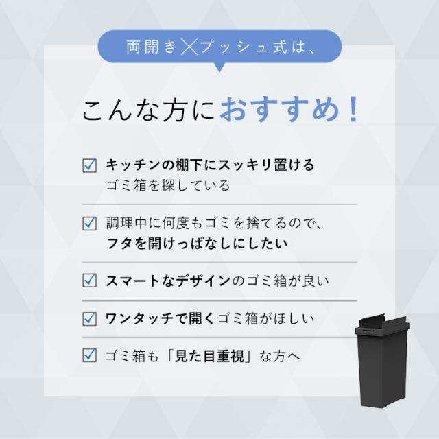 【両開き×プッシュ式で、狭い場所でも使いやすい!おしゃれで快適な日本製ダストボックス20L】