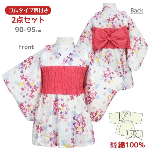 浴衣 ワンピース型 ベビー キッズ 子供 あじさい 簡単帯 兵児帯 2点 セットホワイト-ローズ