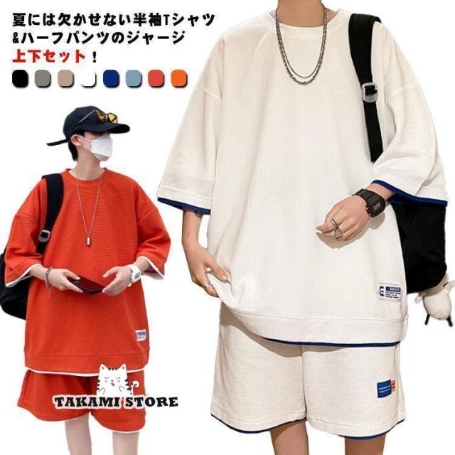 メンズ 上下セット 半袖 tシャツ ハーフパンツ 夏 スウェット ジャージ 上下セット ワッフル 半袖Tシャツ 短パン スポーツウェア ルー