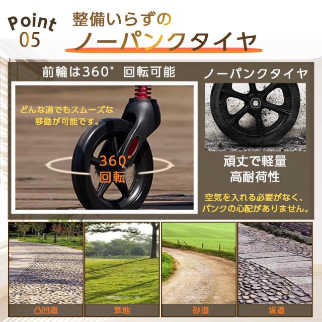 タイヤはノーパンクタイヤ設計で空気入れの手間もなく、パンクの心配もありません。