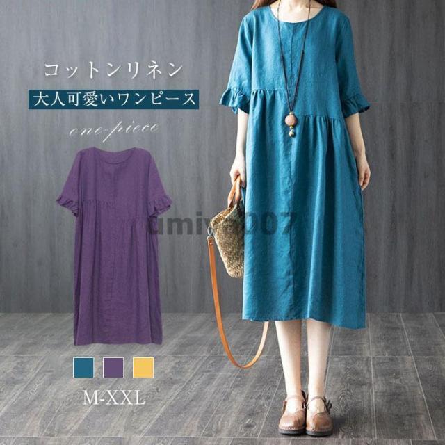 ワンピース ロングワンピース レディース 半袖 ナチュラル ロング丈 ワンピース 五分袖 膝丈ワンピース カジュアル 春 夏 ゆったり 20代 30代 40代