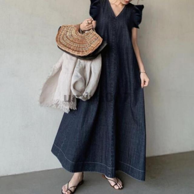 キーワード ワンピース レディース ロングワンピース ロング丈 フレア袖 ワンピ ロング Vネック デニムワンピース デニム 無地 バックリボン 体型カバー ゆったり ゆるっとワンピース シンプル ロングワンピ かわいい 春 夏 大きいサイズ カジュアル 30代 40代 50代 着回し