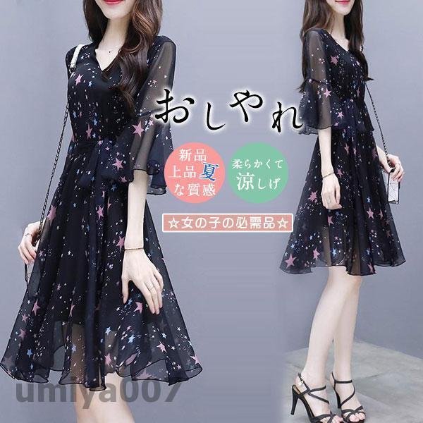 【キーワード】ワンピース 星柄 花柄 レデイース ロング丈 半袖 フレア シフォンワンピース 春夏 おしゃれ きれいめ 20代 30代 ファッション ロングワンピース カジュアル ゆったり 着痩せ 可愛い 韓国風 シンプル 大人 通勤 OL 夏ワンピース 夏新品 母の日 プレゼント ギフト ミモレ丈