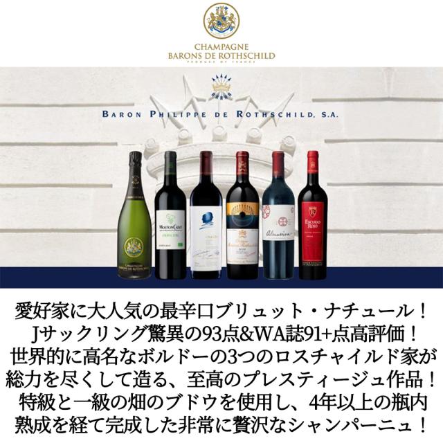 愛好家に大人気の最辛口ブリュット・ナチュール! Jサックリング驚異の93点&WA誌91+点高評価!世界的に高名なボルドーの3つのロスチャイルド家が総力を尽くして造る、至高のプレスティージュ作品!特級と一級の畑のブドウを使用し、4年以上の瓶内熟成を経て完成した非常に贅沢なシャンパーニュ!
