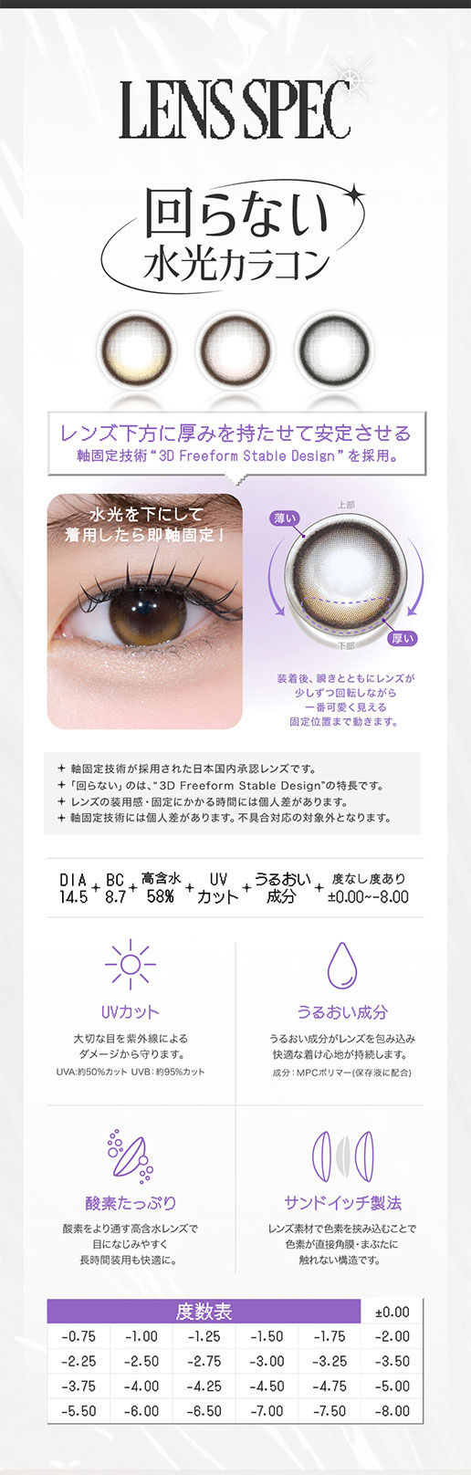 〇販売度数:±0.00(度なし),-0.75〜-5.00(0.25単位),-5.50〜-8.00(0.50単位)