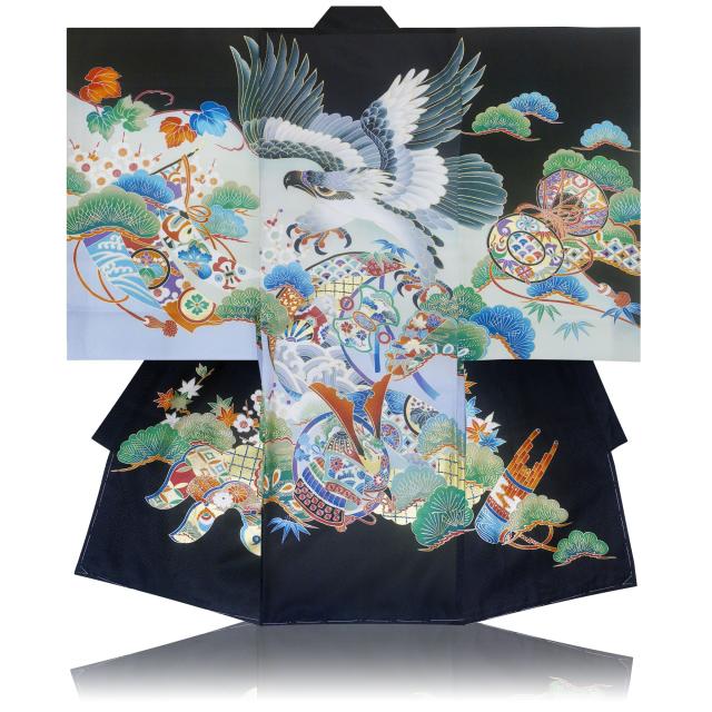 男児 産着 レンタル お宮参り 着物 帽子 よだれかけ セット【男の子 貸衣装 和服 祝い着 初着 産着 往復送料無料】黒 鷹 兜 タカ カブト 松竹梅