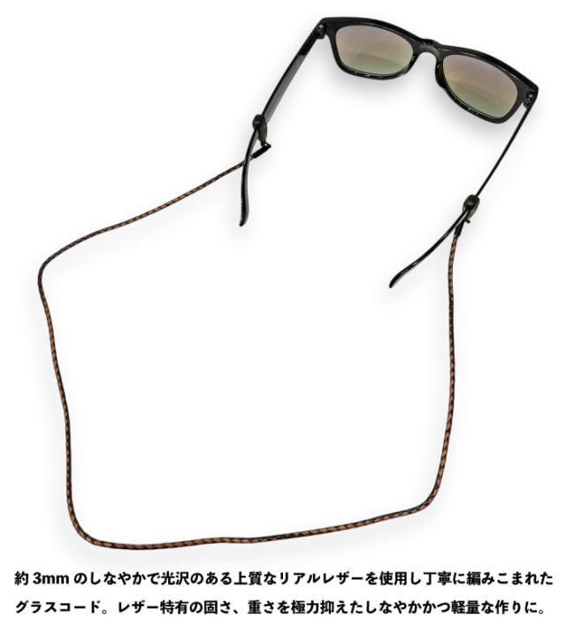 約3mmのしなやかで光沢のある上質なリアルレザーを使用し丁寧に編みこまれたグラスコード。